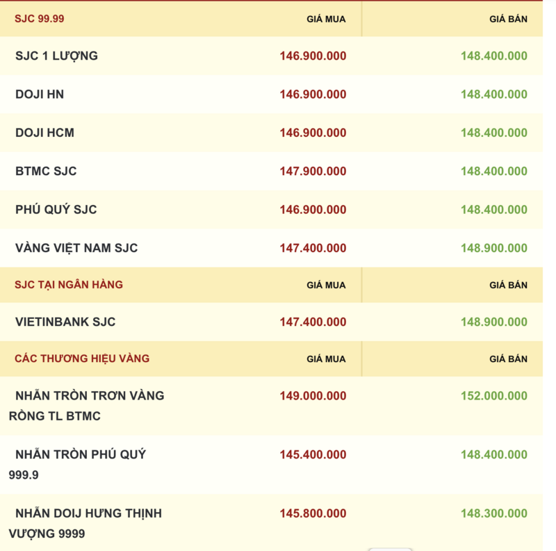 Giá vàng miếng được Công ty TNHH MTV Vàng bạc đá quý Sài Gòn - SJC, Tập đoàn DOJI, PNJ cùng niêm yết giá vàng ở mức 146,9 - 148,4 triệu đồng/lượng (mua vào - bán ra), mức giá giảm 600.000 đồng/lượng ở chiều mua - giảm 800.000 đồng/lượng ở chiều bán so với ngày hôm qua.