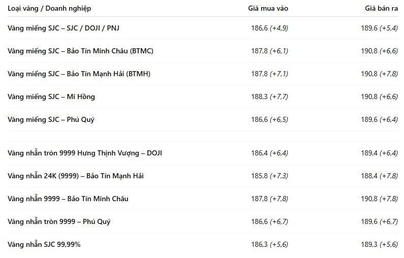 Cụ thể, tại Công ty SJC, Tập đoàn DOJI và PNJ, giá vàng miếng SJC được niêm yết ở mức 186,6–189,6 triệu đồng/lượng. So với hôm qua, giá vàng tăng 4,9 triệu đồng/lượng ở chiều mua vào và tăng 5,4 triệu đồng/lượng ở chiều bán ra, chênh lệch giá duy trì quanh mức 3 triệu đồng/lượng.