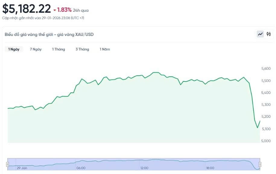 Trước đó, vào khoảng 22h30 tối 29/1 (giờ Việt Nam), thị trường vàng thế giới bất ngờ ghi nhận nhịp giảm rất mạnh trong thời gian ngắn. Dữ liệu từ sàn Kitco cho thấy giá vàng giao ngay rơi nhanh từ vùng 5.300 USD/ounce lúc 22h26 xuống còn khoảng 5.182 USD/ounce vào 22h30, tương đương mức giảm gần 150 USD/ounce chỉ trong vài phút. So với mặt bằng giao dịch ổn định quanh 5.500 USD/ounce trước thời điểm điều chỉnh, giá vàng thế giới đã giảm gần 400 USD/ounce trong thời gian ngắn.