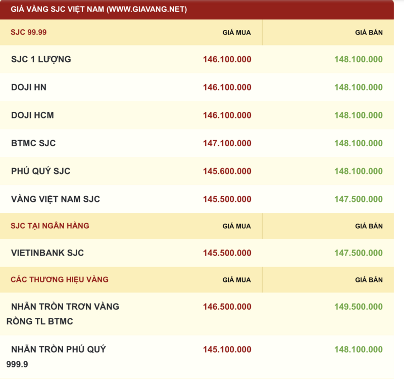 Giá vàng miếng được Công ty TNHH MTV Vàng bạc đá quý Sài Gòn - SJC, Tập đoàn DOJI, PNJ cùng niêm yết giá vàng ở mức 146,1 - 148,1 triệu đồng/lượng (mua vào - bán ra), mức giá tăng 3 triệu đồng/lượng ở cả hai chiều mua - bán so với hôm qua.