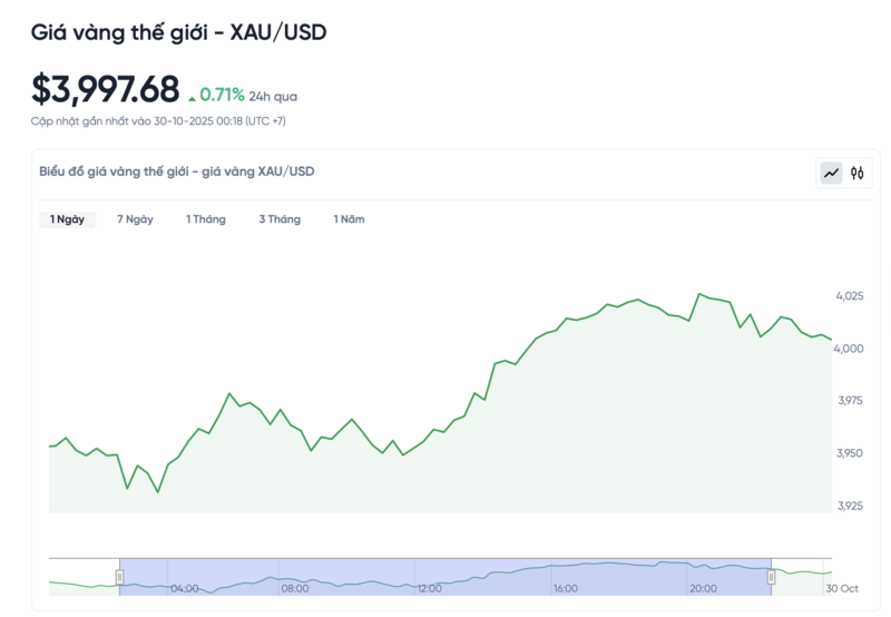 Giá vàng thế giới hôm nay 30/10/2025 và biểu đồ biến động giá vàng thế giới 24h qua