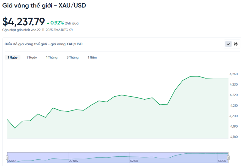 Giá vàng thế giới hôm nay 30/11/2025 và biểu đồ biến động giá vàng thế giới 24h qua