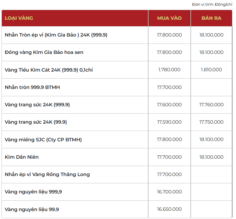 Bảo Tín Mạnh Hải niêm yết giá nhẫn tròn ép vỉ Kim Gia Bảo ở mức 178 - 181 triệu đồng/lượng (mua vào - bán ra), giảm 2 triệu đồng/lượng cả hai chiều mua vào và bán ra so với chốt phiên giao dịch trước.