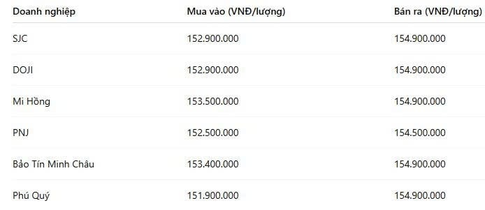 DOJI cũng ghi nhận diễn biến tương tự, khi niêm yết giá mua vào ở mức 152,9 triệu đồng/lượng và bán ra ở 154,9 triệu đồng/lượng. So với phiên liền trước, doanh nghiệp điều chỉnh tăng 1,1 triệu đồng ở cả hai chiều giao dịch.