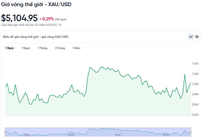 Giá vàng thế giới hôm nay 07/03/2026 và biểu đồ biến động giá vàng thế giới 24h qua