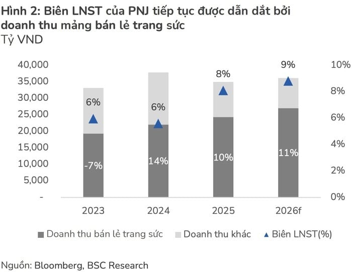 Những nỗ lực này đã phần nào phản ánh vào kết quả kinh doanh quý IV/2025. Theo BSC, doanh thu bán lẻ trang sức của PNJ trong quý này tăng 27% so với cùng kỳ, trong khi lợi nhuận ghi nhận mức tăng tới 66%.