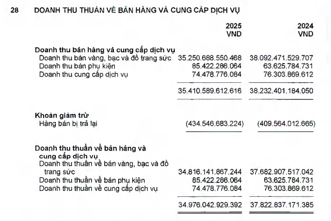 margin: 15px auto;" />Theo báo cáo tài chính hợp nhất vừa công bố, doanh thu bán hàng và cung cấp dịch vụ của PNJ đạt khoảng 35.410,6 tỷ đồng, giảm 7,4% so với năm 2024. Sau khi trừ các khoản giảm trừ hơn 434,5 tỷ đồng (tăng 6,1%), doanh thu thuần còn 34.976,0 tỷ đồng, tương ứng mức giảm 7,5%.