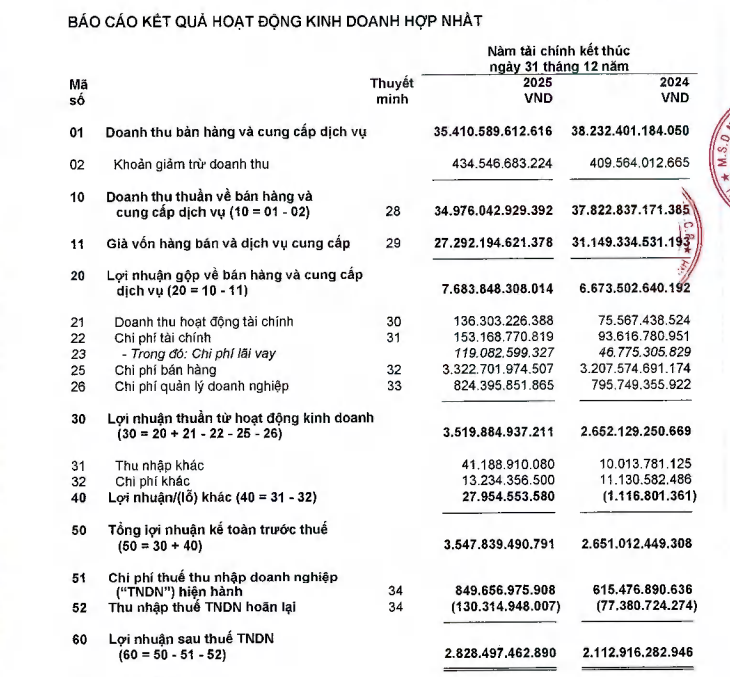Kết quả, lợi nhuận thuần từ hoạt động kinh doanh đạt 3.519,9 tỷ đồng, tăng 32,7% so với năm trước. Sau khi trừ thuế, lợi nhuận sau thuế đạt 2.828,5 tỷ đồng, tăng 33,9%, tương ứng tăng thêm hơn 715 tỷ đồng. Theo giải trình của doanh nghiệp, tăng trưởng lợi nhuận đến từ việc cải thiện biên lợi nhuận, kiểm soát chi phí và tận dụng diễn biến giá vàng trong hoạt động kinh doanh.