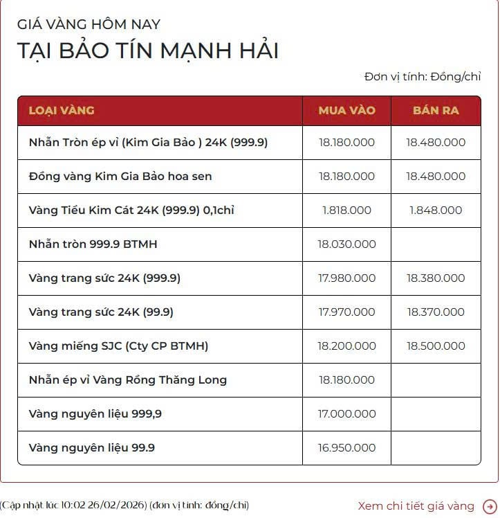- Giá vàng Bảo Tín Mạnh Hải điều chỉnh ra sao trước ngày vía Thần Tài?