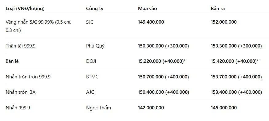 margin: 15px auto;" />Tại TP.HCM, vàng nhẫn SJC 99,99% đang được niêm yết ở mức 149.400.000 đồng/lượng mua vào và 152.000.000 đồng/lượng bán ra, đi ngang so với cuối ngày hôm qua. Nhẫn Phú Quý 999.9 điều chỉnh tăng nhẹ 300.000 đồng/lượng, lên 150.300.000 – 153.300.000 đồng/lượng.
