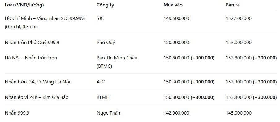 Tại TP.HCM, vàng nhẫn SJC 99,99% đang được niêm yết ở mức 149,5 triệu đồng/lượng mua vào và 152,1 triệu đồng/lượng bán ra. So với hôm qua, mức giá gần như không thay đổi.
