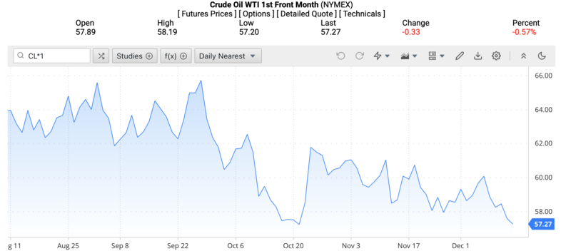 Giá dầu WTI trên thị trường thế giới rạng sáng ngày 13/12/2025 (theo giờ Việt Nam). Nguồn: Oilprice.
