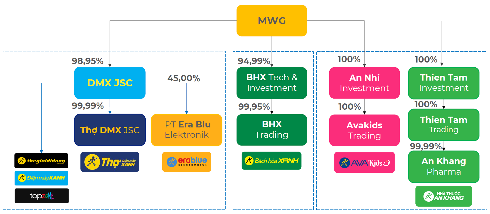 Trong cấu trúc mới, DMX được định vị là hệ sinh thái bán lẻ điện thoại – điện máy quy mô lớn, bao gồm các chuỗi cốt lõi như Thế Giới Di Động, Điện Máy Xanh và TopZone. Bên cạnh đó, doanh nghiệp còn phát triển các trụ cột tăng trưởng mới như dịch vụ Thợ Điện Máy Xanh và liên doanh EraBlue tại Indonesia.