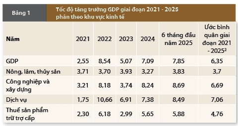 Giai đoạn 2021 - 2025, kinh tế Việt Nam phải đối mặt với nhiều khó khăn, thách thức. Bối cảnh kinh tế toàn cầu diễn ra không thuận lợi, phức tạp, khó đoán định với nhiều vấn đề ngoài tầm dự báo như đại dịch Covid-19, suy thoái kinh tế và căng thẳng địa chính trị leo thang, kéo dài ở nhiều nơi như Nga - Ukraine, Trung Đông; các căng thẳng thương mại và xu hướng đẩy mạnh bảo hộ nhằm bảo vệ sản xuất trong nước, xu hướng dịch chuyển tiêu dùng vào nội địa… của nhiều nền kinh tế lớn đã tác động không nhỏ đến nền kinh tế có độ mở lớn và dựa nhiều vào xuất khẩu như Việt Nam. Cùng với đó, việc định hình và đa dạng hóa chuỗi cung ứng, đẩy mạnh phát triển kinh tế số, đổi mới sáng tạo và kinh tế xanh… đã tạo sức ép lớn, đòi hỏi nước ta cần có sự đổi mới, cải cách mạnh mẽ hơn nữa. Trong nước, nền kinh tế phải đối mặt với các khó khăn, thách thức lớn từ chất lượng tăng trưởng, biến đổi khí hậu, già hóa dân số… Trong bối cảnh đó, kinh tế ghi nhận sự biến động mạnh về tốc độ tăng trưởng, phản ánh cả tác động tiêu cực của dịch Covid-19 và khả năng phục hồi của nền kinh tế. Năm 2021, GDP chỉ tăng 2,55%, mức tăng thấp nhất trong hơn ba thập niên do gián đoạn chuỗi cung ứng, sụt giảm tiêu dùng và sản xuất, cùng với các biện pháp giãn cách xã hội trên diện rộng. Bước sang năm 2022, khi nền kinh tế mở cửa hoàn toàn sau dịch bệnh, tăng trưởng GDP đạt 8,54%, được thúc đẩy bởi tiêu dùng nội địa phục hồi, đầu tư FDI gia tăng và xuất khẩu tăng trưởng mạnh mẽ gần 15%. Năm 2023 và 2024, mặc dù kinh tế thế giới tăng trưởng chậm do áp lực lạm phát toàn cầu và chính sách tiền tệ thắt chặt ở nhiều quốc gia, Việt Nam vẫn duy trì ổn định kinh tế vĩ mô, củng cố niềm tin thị trường và tiếp tục thu hút vốn đầu tư nước ngoài, tốc độ tăng trưởng GDP lần lượt là 5,07% và 7,09%. Năm 2025 Việt Nam đặt mục tiêu GDP tăng 8,3% - 8,5%. Riêng 9 tháng đầu năm 2025 ước tăng 7,85% so với cùng kỳ năm trước, chỉ thấp hơn tốc độ tăng 9,44% của cùng kỳ năm 2022 trong giai đoạn 2021 - 2025 và dự kiến tốc độ tăng trưởng cả năm 2025 có thể đạt từ 8% (theo mục tiêu đề ra tại Nghị quyết số 25/NQ-CP ngày 05/02/2025 của Chính phủ) đến 8,5% (theo mục tiêu đề ra tại Nghị quyết số 226/NQ-CP ngày 05/8/2025 của Chính phủ). Bình quân mỗi năm trong giai đoạn 2021 - 2025, tăng trưởng GDP đạt 6,23%. (Bảng 1)