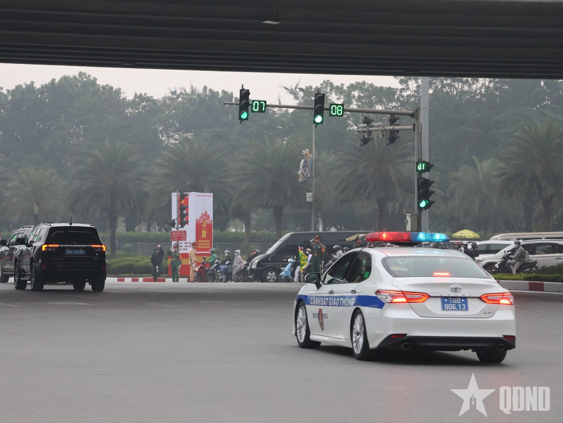 | Hệ thống đèn tín hiệu chuyển chế độ “làn sóng xanh” mở đường cho đoàn xe chở đại biểu dự Đại hội |