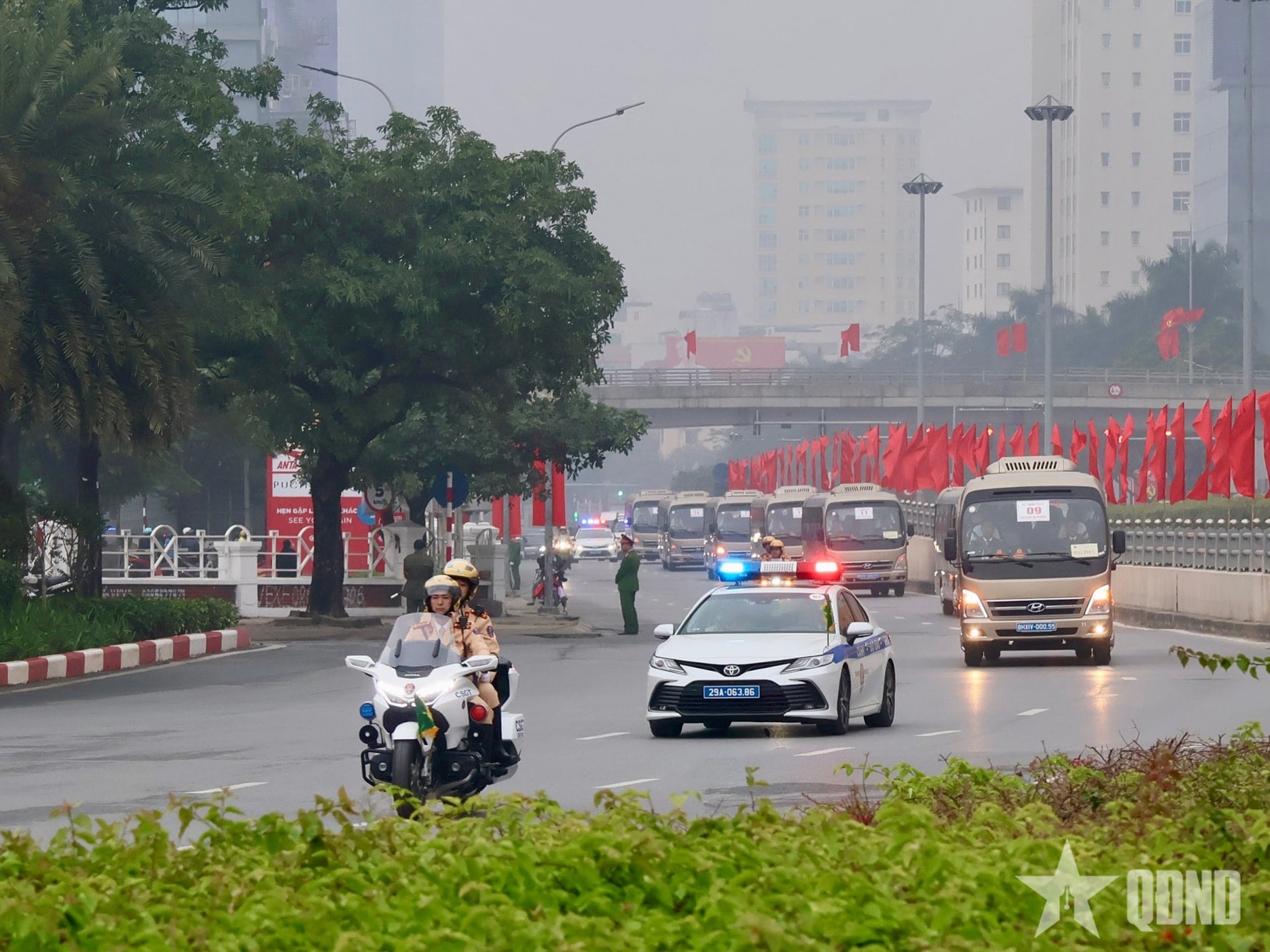 | Cảnh sát giao thông dẫn đoàn xe chở đại biểu dự Đại hội trên tuyến Trần Duy Hưng |