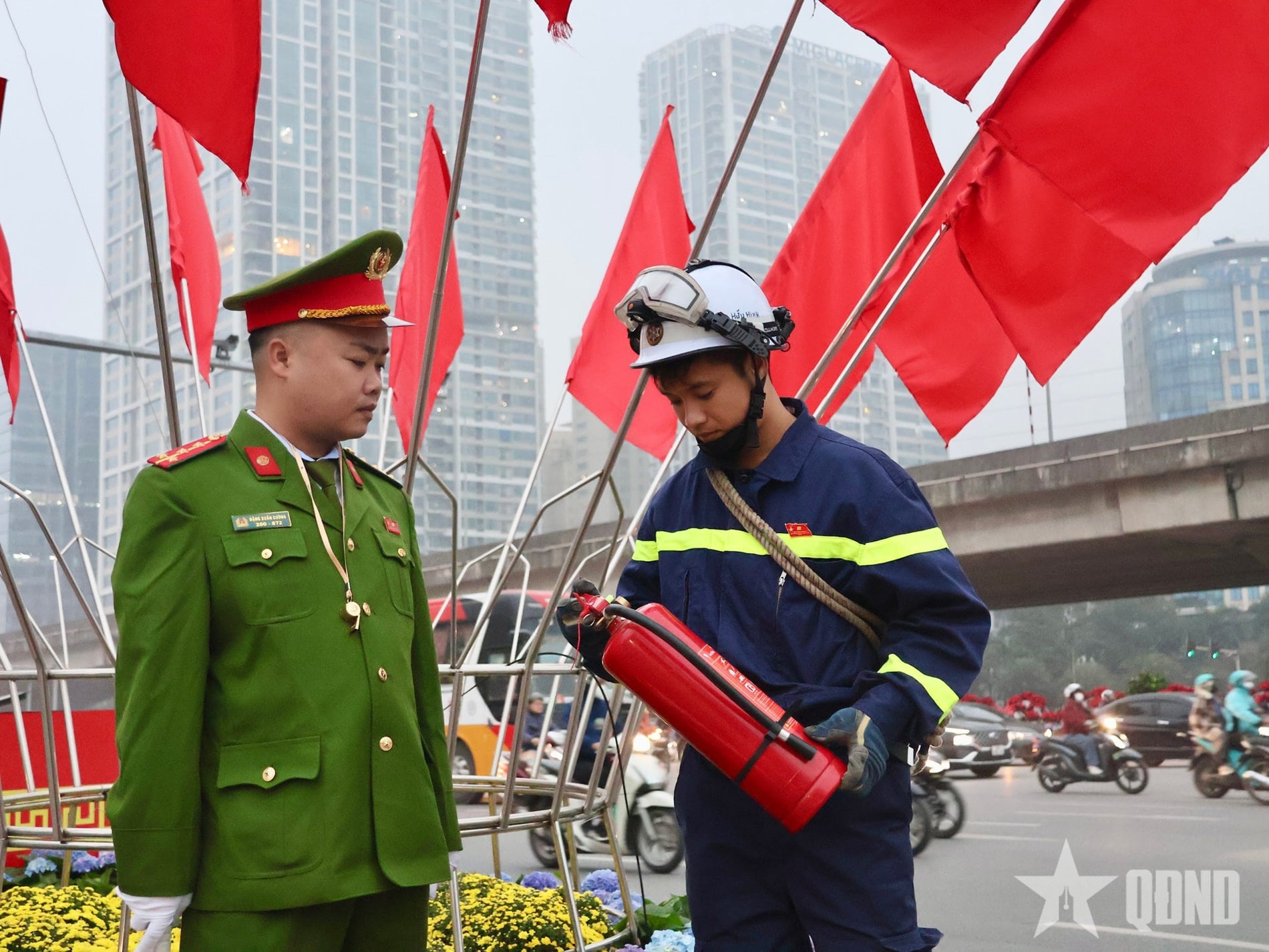 | Lực lượng Công an cơ sở và Cảnh sát PCCC&CHCN kiểm tra thiết bị bảo đảm an toàn PCCC tại các vị trí bảo vệ |