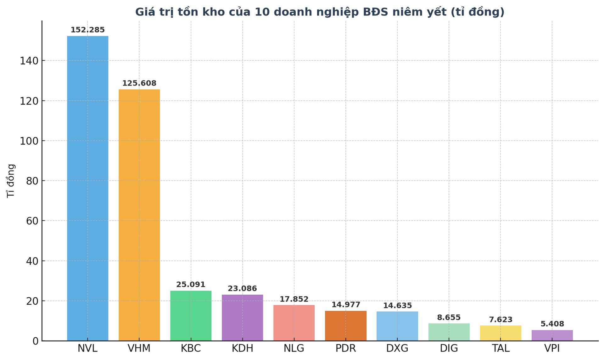 Ở nhóm đầu ngành, NovaLand và Vinhomes tiếp tục dẫn đầu về quy mô hàng tồn kho. Trong đó, NovaLand ghi nhận 152.285 tỷ đồng, chủ yếu là các dự án bất động sản để bán đang xây dựng, chiếm hơn 95% tổng giá trị. Vinhomes đạt 125.690 tỷ đồng, tăng gấp đôi so với cùng kỳ, với phần lớn là các dự án nhà ở đang trong quá trình hoàn thiện.