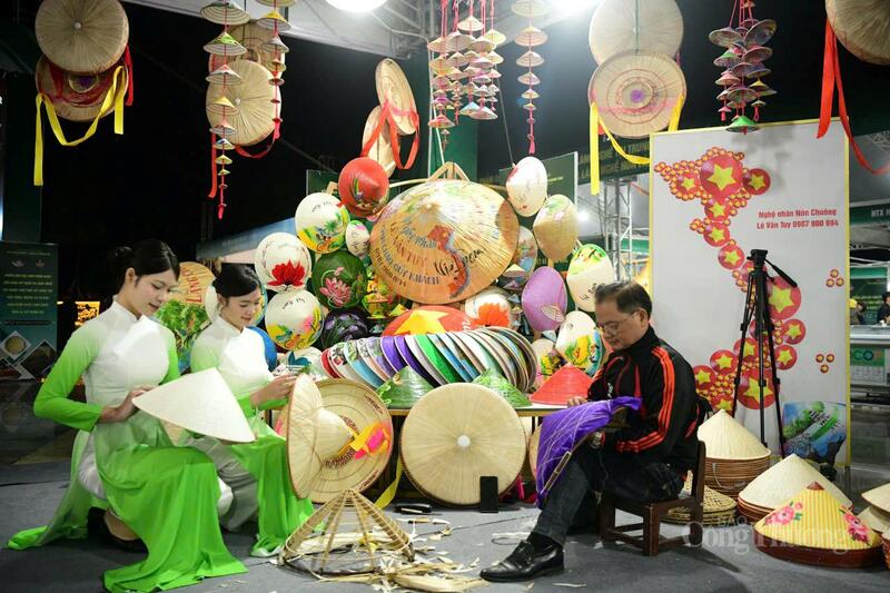 Nghệ nhân nón Chuông Lê Văn Tuy trình diễn cách làm sản phẩm làng nghề tại Triển lãm. Ảnh: N.H