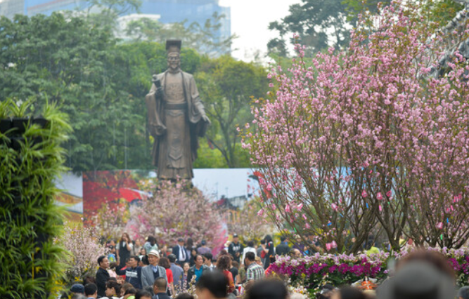 Đào bích, đào phai, đào thế khoe sắc bên tượng đài Lý Thái Tổ, tạo điểm nhấn văn hóa đặc biệt.