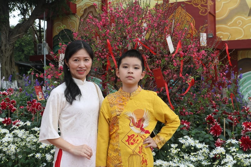Chị Đặng Hương cùng con trai tham quan tại "Đường hoa tết" Hoàng Thành Thăng Long.