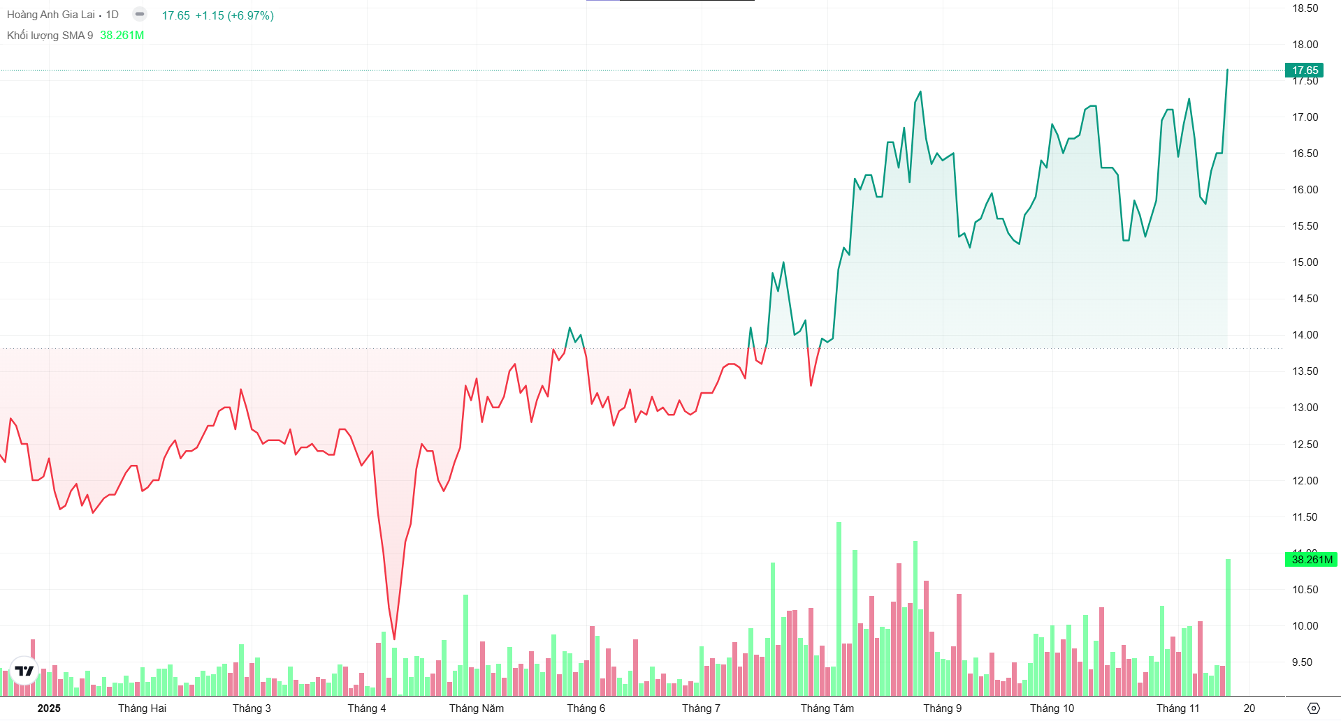 Chỉ một ngày sau khi DGC gây chú ý, thị trường tiếp tục chứng kiến một hiện tượng tương tự. Phiên 14/10, cổ phiếu HAG của Công ty CP Hoàng Anh Gia Lai bật tăng kịch trần lên 17.650 đồng/cp, chính thức vượt đỉnh lịch sử. Hơn 37 triệu cổ phiếu được sang tay trong phiên, gấp ba lần trung bình 20 phiên; khối ngoại cũng mua ròng 60 tỷ đồng.