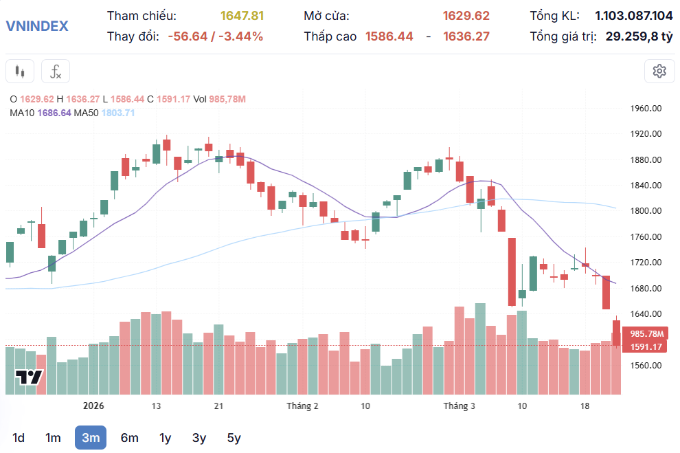 (Banker.vn) VN-Index mở màn tuần mới (ngày 23/3) đầy sóng gió khi chính thức đánh mất mốc tâm lý 1.600 điểm dưới áp lực cộng hưởng từ bất ổn địa chính trị toàn cầu.