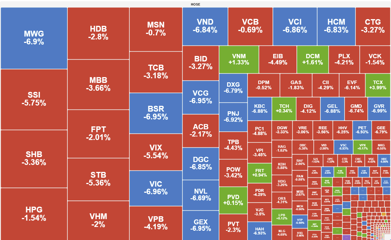 Nhóm vốn hóa lớn bao gồm ngân hàng, chứng khoán, bất động sản và bán lẻ trở thành "tâm bão" của đà sụt giảm, dẫn đầu là các mã VHM (-6,1%), VIC (-1,65%) và HDB (-3,8%). Tâm lý thận trọng dâng cao tột độ khi thị trường tài chính Việt Nam chịu tác động trực tiếp từ những bất ổn địa chính trị đang leo thang trên thế giới, khiến dòng tiền nội không còn mặn mà với việc bắt đáy sớm.