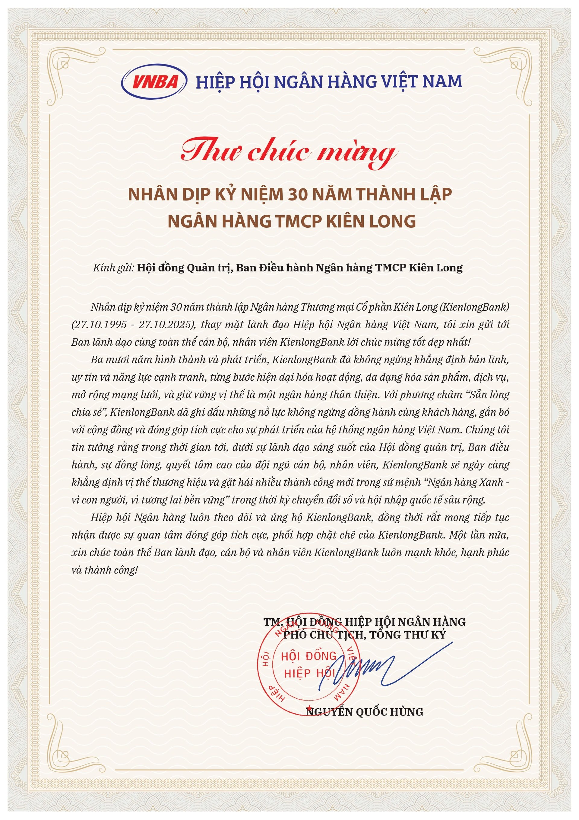 Nhân kỷ niệm 30 năm thành lập Ngân hàng TMCP Kiên Long - KienlongBank (27/10/1995 - 27/10/2025), thay mặt lãnh đạo Hiệp hội Ngân hàng Việt Nam, Phó Chủ tịch kiêm Tổng Thư ký Nguyễn Quốc Hùng đã gửi thư chúc mừng đến Ban Lãnh đạo và toàn thể cán bộ, nhân viên ngân hàng.