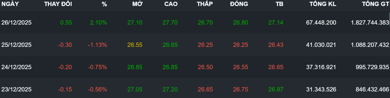 Ngay từ khi mở cửa phiên giao dịch sáng 26/12, cổ phiếu HPG của Tập đoàn Hòa Phát giao dịch tích cực khi tăng lên mức 27.100 đồng/cp, cao hơn hơn 3% so với giá đóng cửa phiên liền trước. Trong phiên sáng, có thời điểm thị giá HPG vọt lên 27.700 đồng/cp, qua đó tạm thời chấm dứt chuỗi ba phiên giảm điểm liên tiếp.