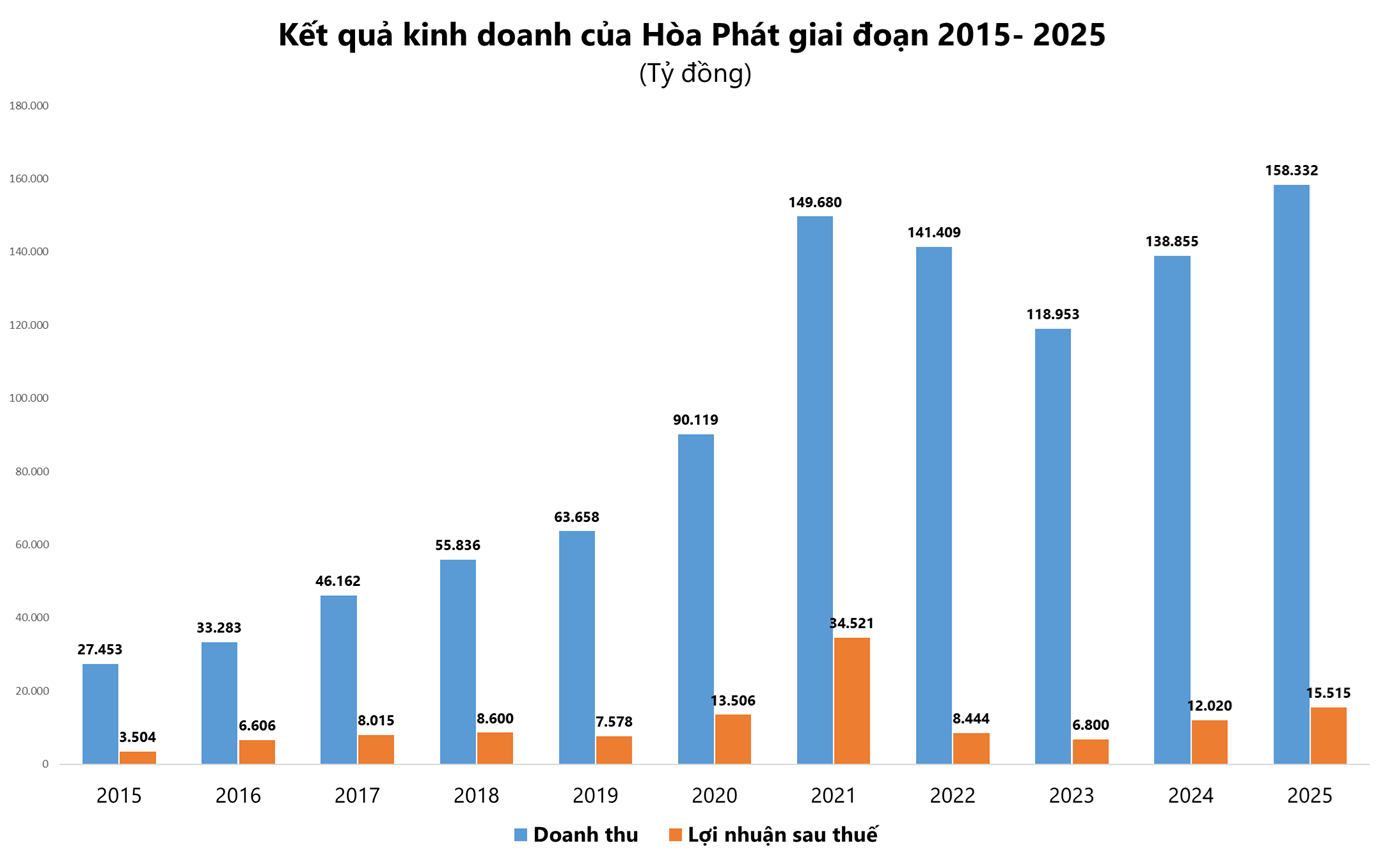 (Banker.vn) Lũy kế cả năm 2025, Hòa Phát ghi nhận doanh thu thuần đạt 158.332 tỷ đồng và lợi nhuận sau thuế 15.515 tỷ đồng, lần lượt tăng 13% và 29% so với năm 2024.