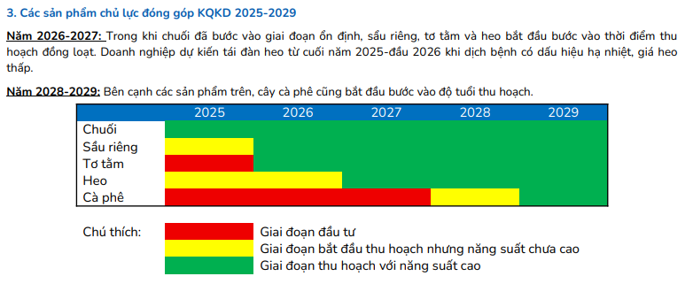 Hiện mảng chuối đã vận hành ổn định. HAG dự kiến giai đoạn 2026-2027 sẽ là thời điểm sầu riêng, tơ tằm và heo bắt đầu được khai thác đồng loạt. Doanh nghiệp cũng cho biết sẽ tái đàn heo từ cuối năm nay khi dịch bệnh đã hạ nhiệt và giá heo đang ở vùng thấp. Đến giai đoạn 2028-2029, cà phê sẽ bước vào thời điểm thu hoạch.