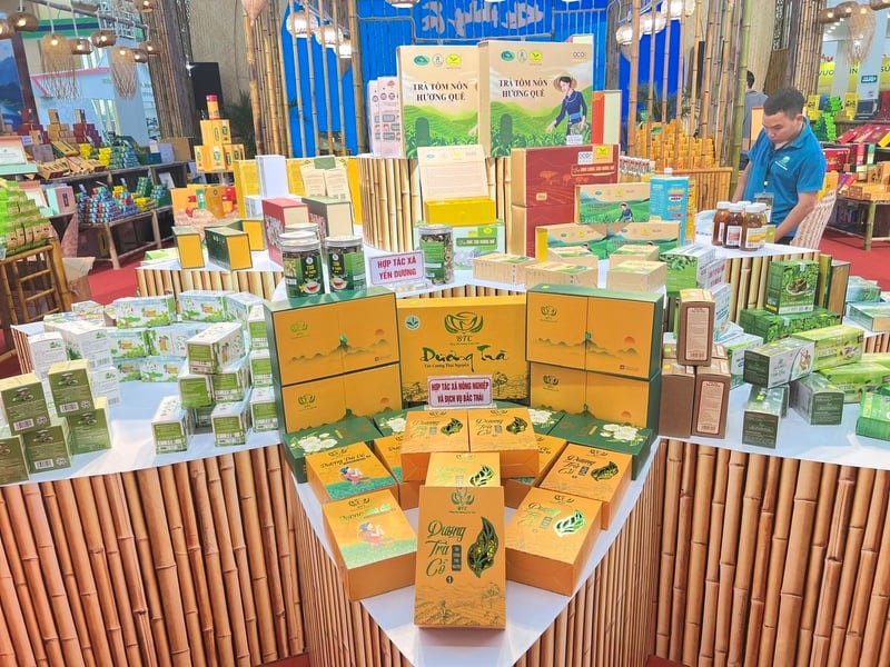 Các sản phẩm của Hợp tác xã chè Núi Hồng được giới thiệu tại hội chợ.