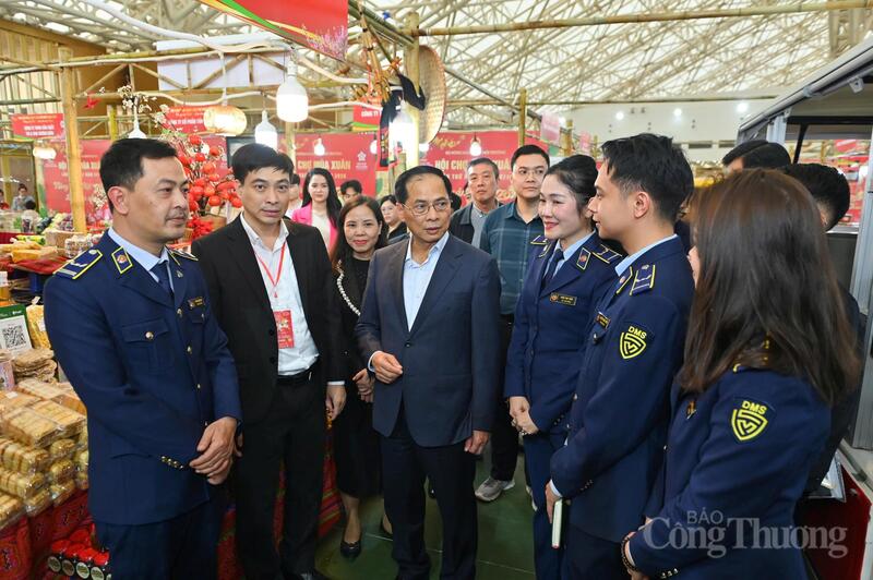 Phó Thủ tướng Bùi Thanh Sơn trao đổi với lực lượng quản lý thị trường tại Hội chợ. Ảnh: Nam Nguyễn