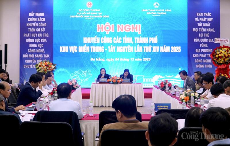 Chiều 4/12, tại TP. Đà Nẵng, Cục Đổi mới sáng tạo, Chuyển đổi xanh và Khuyến công phối hợp với Sở Công Thương Đà Nẵng tổ chức Hội nghị Khuyến công tác tỉnh thành phố khu vực miền Trung - Tây Nguyên lần thứ XIV năm 2025. Hội nghị nhằm đánh giá kết quả công tác khuyến công năm 2024, 11 tháng năm 2025, đề ra các giải pháp hoàn thành tốt mục tiêu khuyến công năm 2025 tại 11 tỉnh, thành phố khu vực miền Trung - Tây Nguyên.