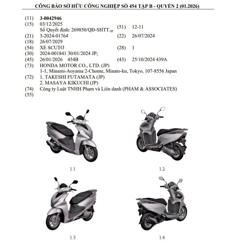 margin: 15px auto;" />Hình ảnh trong Công báo sở hữu công nghiệp số 454 (tập B) cho thấy mẫu xe mới mang nhiều đường nét quen thuộc, gợi liên tưởng đến Honda LEAD 125 – dòng xe tay ga gia đình vốn rất được ưa chuộng tại Việt Nam. Tuy nhiên, loạt chi tiết tinh chỉnh cho thấy đây không đơn thuần là bản nâng cấp nhẹ mà có thể là một mẫu xe hoàn toàn mới.