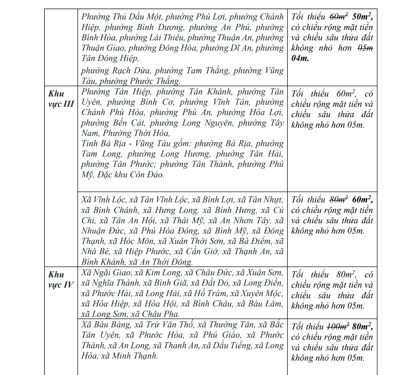 margin: 15px auto;" />Theo dự thảo do Sở Nông nghiệp và Môi trường TP. Hồ Chí Minh xây dựng, Thành phố sau sáp nhập được chia thành bốn khu vực với mức diện tích tách thửa tối thiểu khác nhau. Cụ thể, khu vực I diện tích tối thiểu 36 m2; khu vực II từ 36-60 m2; khu vực III từ 60-80 m2; khu vực IV từ 80-100 m2, kèm điều kiện về chiều rộng mặt tiền, chiều sâu thửa đất.