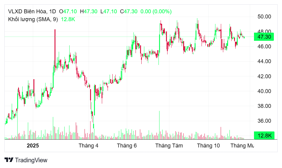Trên thị trường chứng khoán, cổ phiếu VLB ghi nhận đà tăng vững chắc từ đầu năm 2025 đến nay. Từ vùng giá 34.000-36.000 đồng/cp đầu năm, cổ phiếu tăng mạnh trong quý I và bứt phá vào cuối tháng 3, tạo mặt bằng giá mới quanh 45.000 đồng/cp. Đến quý II, VLB tiếp tục chạm gần 49.000 đồng/cp trước khi bước vào giai đoạn tích lũy kéo dài.