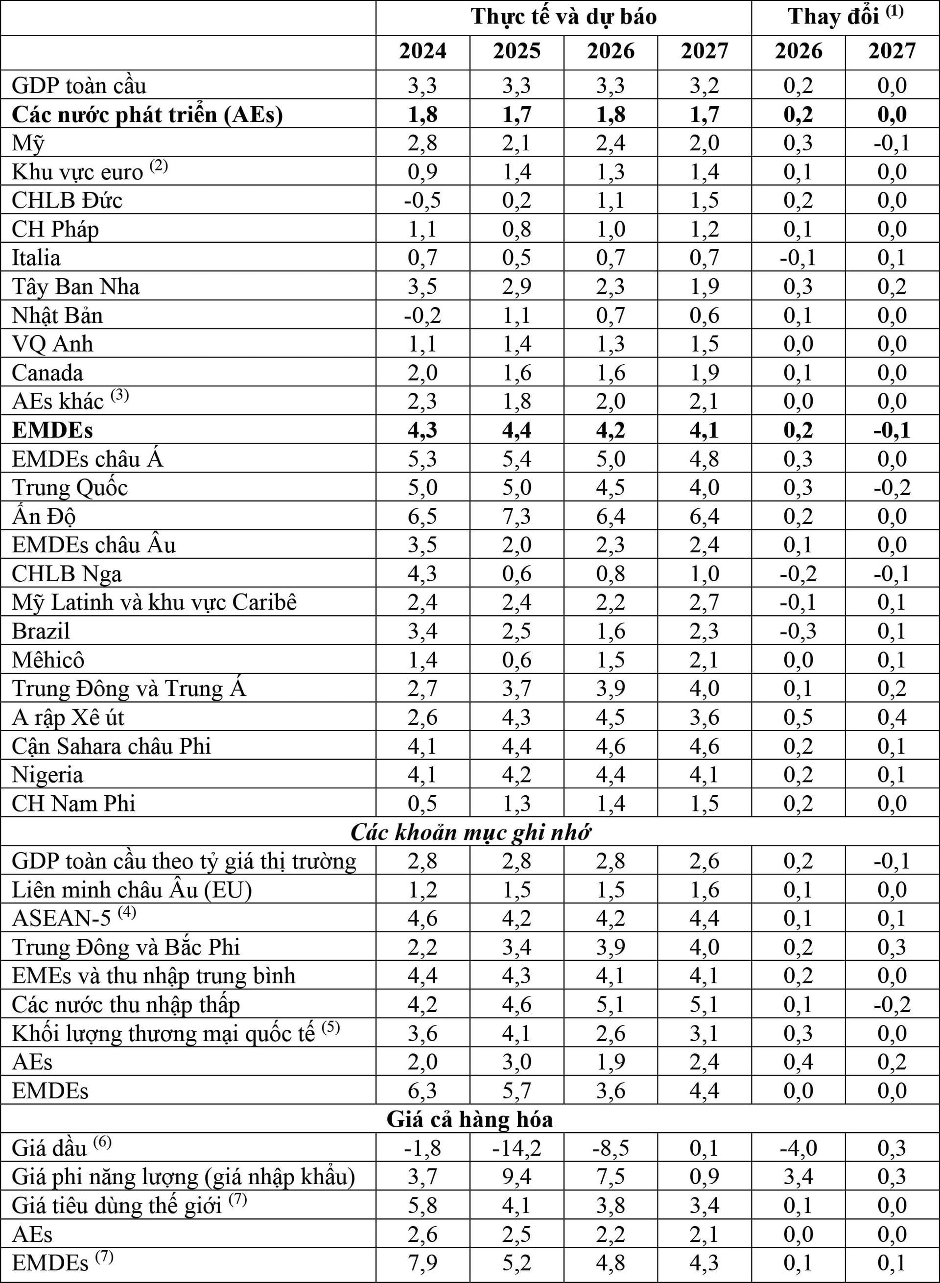 Tại các quốc gia phát triển (AEs), GDP được dự báo sẽ tăng 1,8% trong năm 2026 và 1,7% trong năm 2027. GDP tại Mỹ được kỳ vọng tăng 2,4% trong năm 2026, nhờ sự hỗ trợ của chính sách tài khóa và lãi suất giảm, tác động của hàng rào thuế quan phai nhạt dần. Tại khu vực euro, GDP được kỳ vọng sẽ ổn định ở mức tăng 1,3% trong năm 2026 và 1,4% trong năm 2027. GDP tăng nhẹ trong năm 2027 phản ánh kế hoạch mở rộng chi tiêu công, nhất là tại CHLB Đức, cùng với triển vọng kinh tế tăng cao tại Ireland và Tây Ban Nha. Giá năng lượng tăng cao và gây tác động triền miên sau khi xảy ra cuộc chiến tại Ukraine sẽ tiếp tục cản trở công nghiệp chế tạo, với áp lực bổ sung từ xu hướng tăng giá EUR so với đồng tiền của các quốc gia xuất khẩu hàng hóa tương tự. Tại Nhật Bản, GDP được dự báo sẽ giảm từ kết quả tăng 1,1% trong năm 2025 xuống mức tăng 0,7% trong năm 2026 và 0,6% trong năm 2027, cao hơn so với dự báo đưa ra hồi tháng 10/2025, một phần nhờ gói kích thích tài khóa do Chính phủ thông báo gần đây.