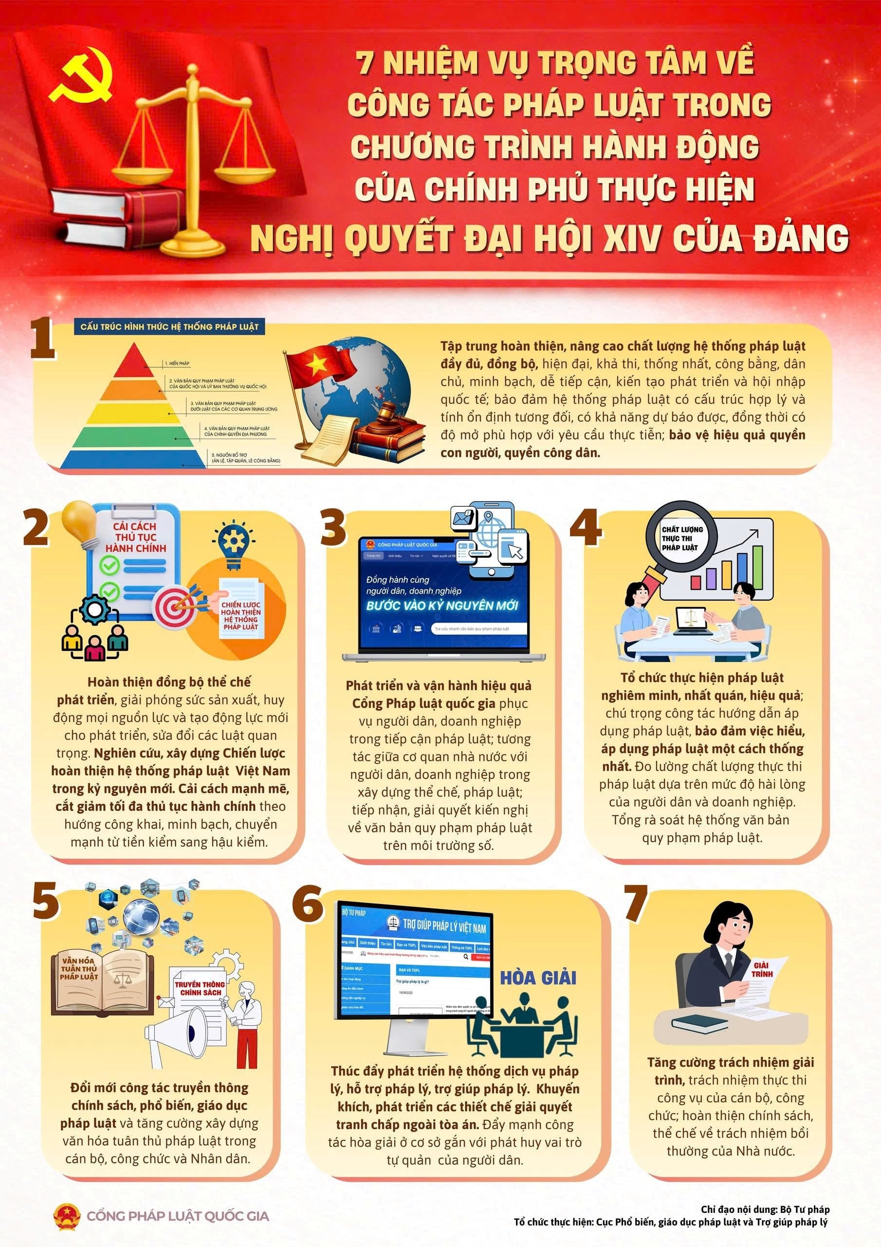 [Infographic] 7 nhiệm vụ trọng tâm về công tác pháp luật trong chương trình hành động của Chính phủ thực hiện Nghị quyết Đại hội XIV của Đảng