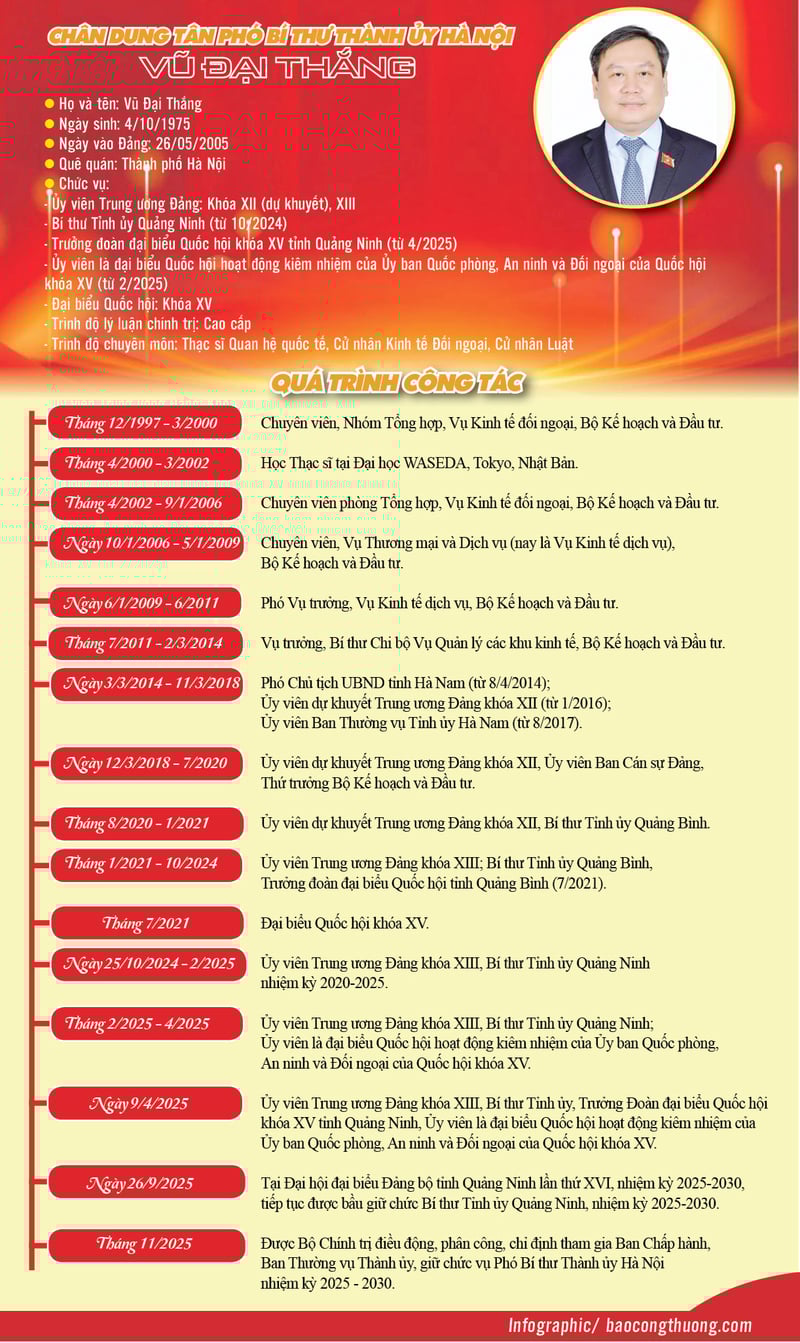 Chiều 28/11, Bộ Chính trị điều động, phân công, chỉ định ông Vũ Đại Thắng tham gia Ban Chấp hành Đảng bộ, Ban Thường vụ Thành ủy Hà Nội, giữ chức Phó Bí thư Thành ủy Hà Nội, nhiệm kỳ 2025-2030.