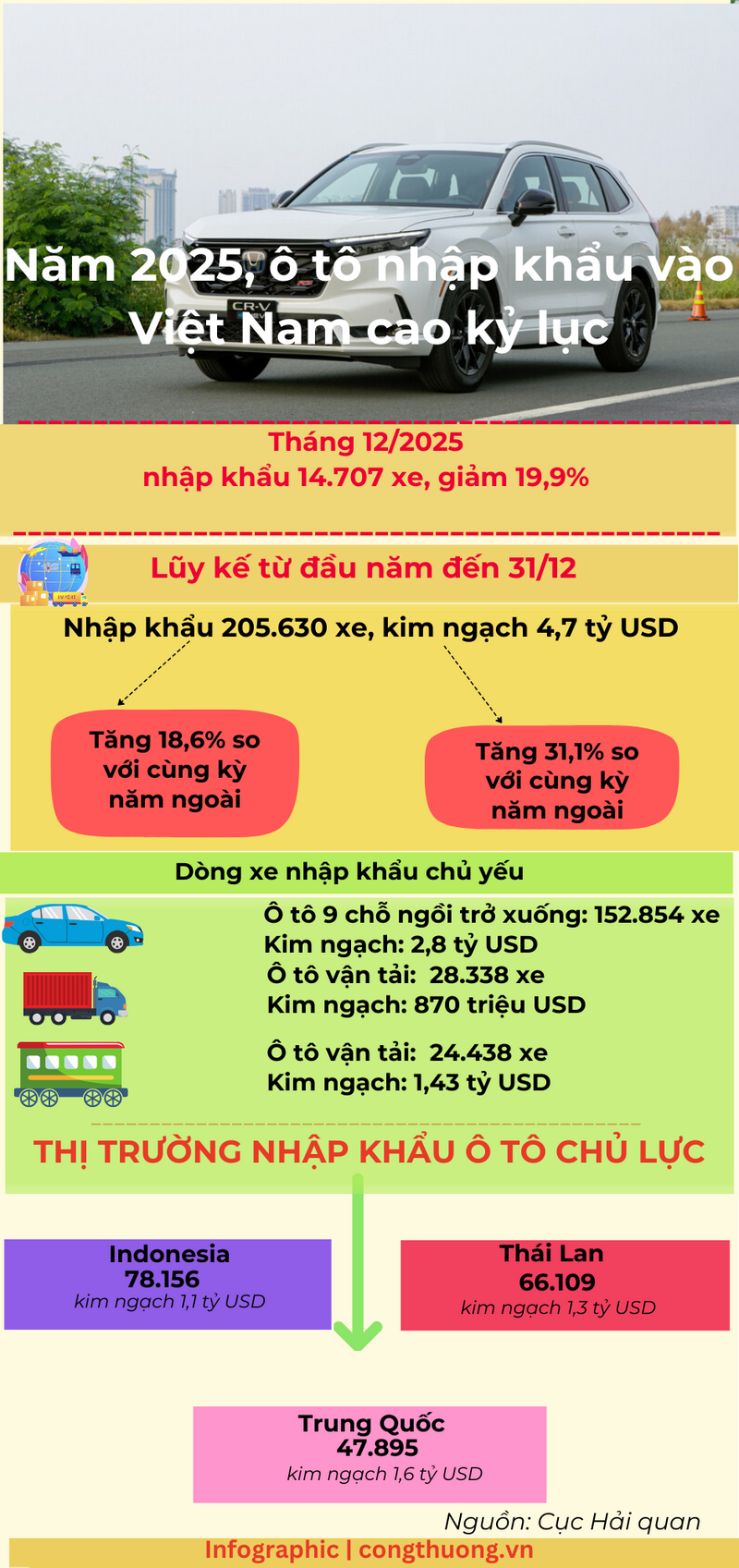 Năm 2025, cả nước nhập khẩu 205.630 ô tô các loại, kim ngạch đạt 4,7 tỷ USD, so với năm 2024, lượng xe tăng 18,6%, trong khi kim ngạch tăng 31,1%. Đây cũng là lần đầu tiên Việt Nam nhập khẩu tới 200.000 ô tô/năm.
