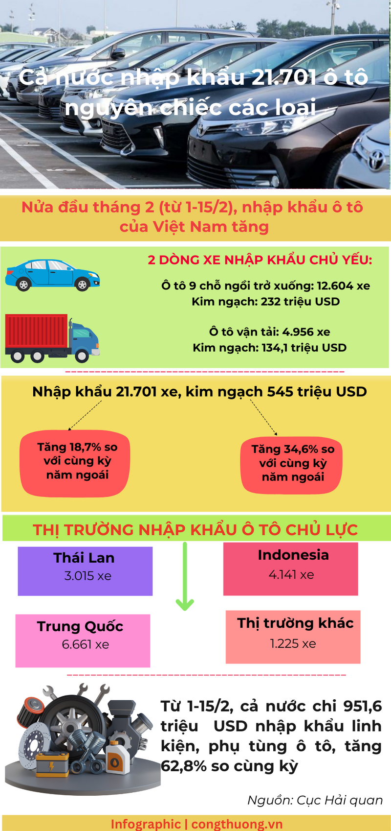 Theo số liệu của Cục Hải quan, trong nửa đầu tháng 2 (từ 1/2 - 15/2), cả nước nhập khẩu 21.701 ô tô nguyên chiếc các loại, kim ngạch 545 triệu USD; tăng 18,7% về lượng và tăng 34,6% về kim ngạch so với cùng kỳ năm ngoái.