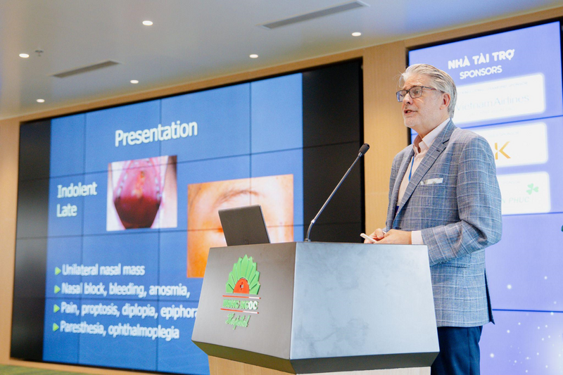 BS Peter Clarke, Chủ tịch Khoa Thanh quản và Mũi, Hội Y học Hoàng gia Anh, trình bày chuyên đề “Những điều cần cân nhắc khi đối mặt với ung thư mũi xoang”- nhóm bệnh hiếm, đa dạng mô học và dễ bị chẩn đoán muộn do triệu chứng tương tự viêm xoang lành tính.