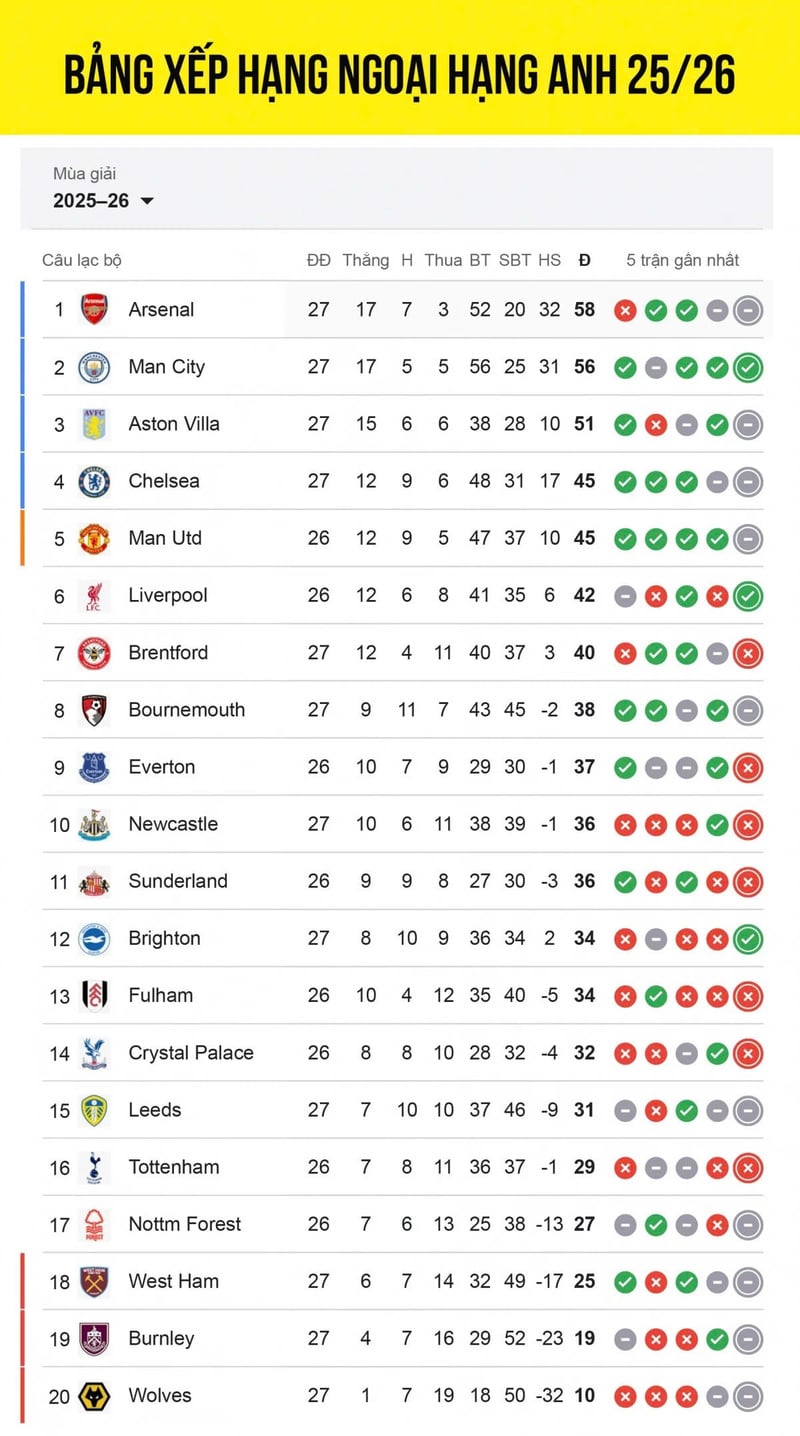 margin: 15px auto;" />Bảng xếp hạng Ngoại hạng Anh 2025/2026 tính đến sáng 22/2.