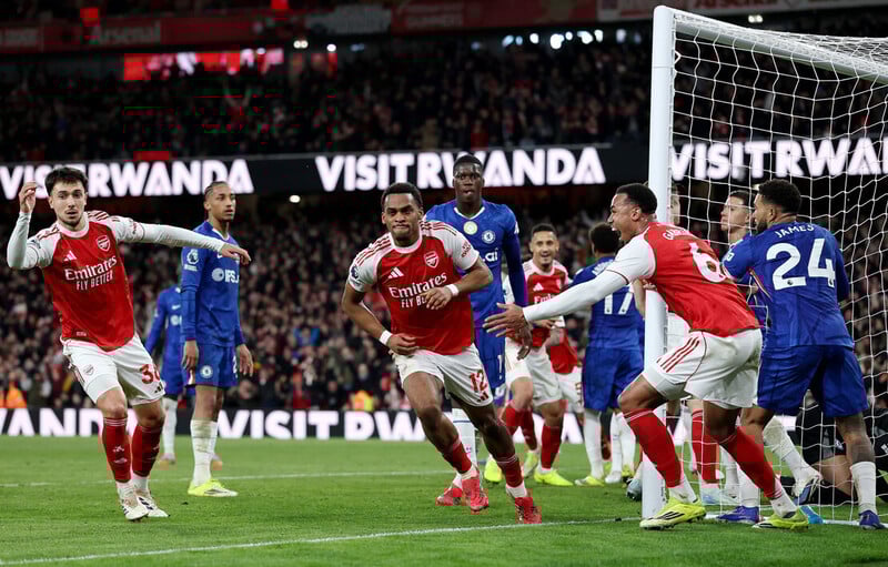 Chelsea nhập cuộc chủ động và tạo ra sức ép đáng kể trong những phút đầu. Ngay phút thứ 10, Mamadou Sarr khiến khán đài Emirates thót tim với cơ hội nguy hiểm nhưng chưa thể chuyển hóa thành bàn thắng. Sau quãng thời gian lép vế, Arsenal dần lấy lại quyền kiểm soát và tìm được bàn mở tỷ số ở phút 21. Từ quả phạt góc của Saka, Gabriel bật cao đánh đầu chuyền bóng để Saliba dứt điểm cận thành, khai thông thế bế tắc.