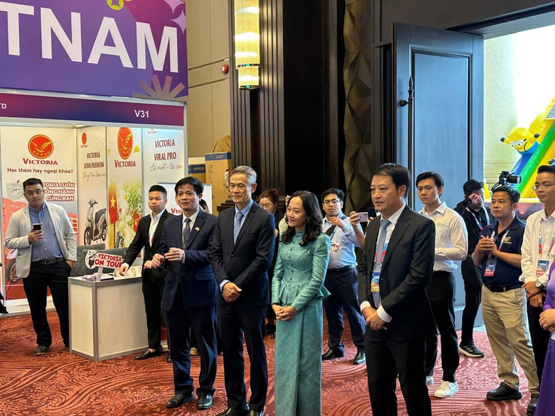 Các gian hàng Việt Nam đã vinh dự đón ông Sun Chanthol - Phó Thủ tướng Campuchia, Phó Chủ tịch thứ nhất Hội đồng Phát triển Campuchia, đại diện cho Thủ tướng Campuchia Samdech Moha Borvor Thipadei Hun Manet, bà Cham Nimul - Bộ trưởng Bộ Thương mại Campuchia đến thăm.