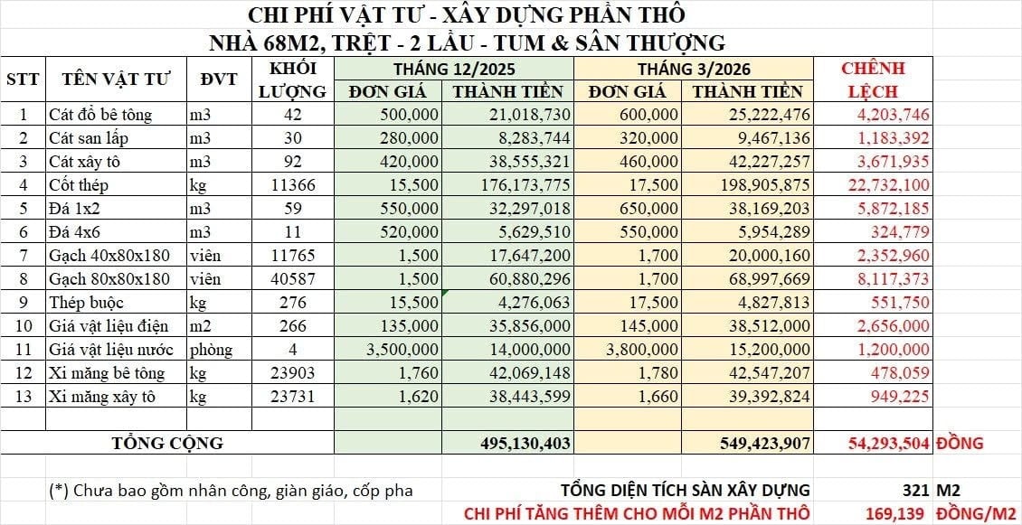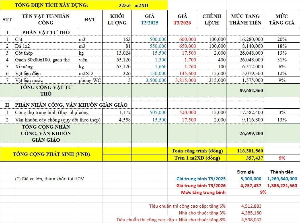 Chẳng hạn, từ một căn nhà có quy mô 325m2 sàn xây dựng, tổng chi phí thi công phần thô tháng 3/2026 so với cùng kỳ năm trước đã tăng thêm khoảng 116 triệu đồng, tương đương mỗi mét vuông tăng khoảng 357.000 đồng.