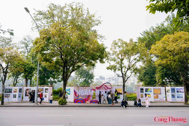 Những khung ảnh khổ lớn được chiếu sáng tinh tế, tạo nên “con đường thị giác” sống động giữa mảng xanh cổ thụ của phố đi bộ.