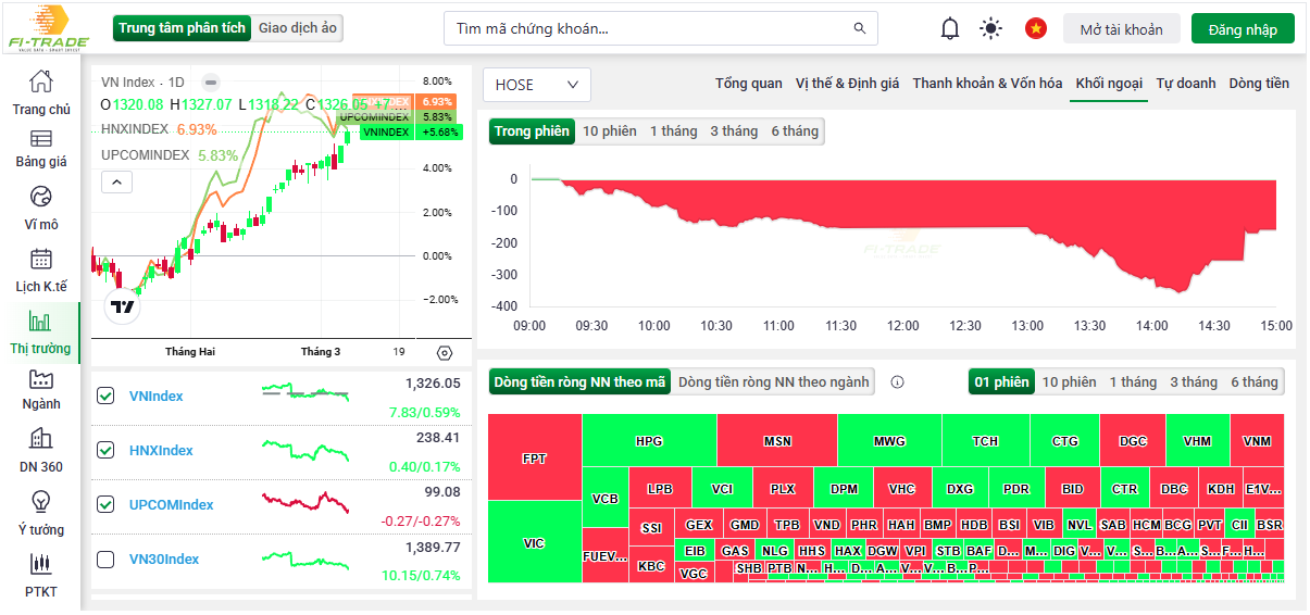 (KTCK) - Phiên giao dịch 7/3, VN-Index tăng 7,83 điểm lên 1.326 điểm, thanh khoản HoSE vượt 20.700 tỷ đồng. Dù khối ngoại bán ròng 218 tỷ đồng, dòng tiền nội vẫn mạnh, tập trung vào VIC, HPG, MWG. Niềm tin thị trường đang được củng cố bởi sự ổn định của dòng vốn trong nước.